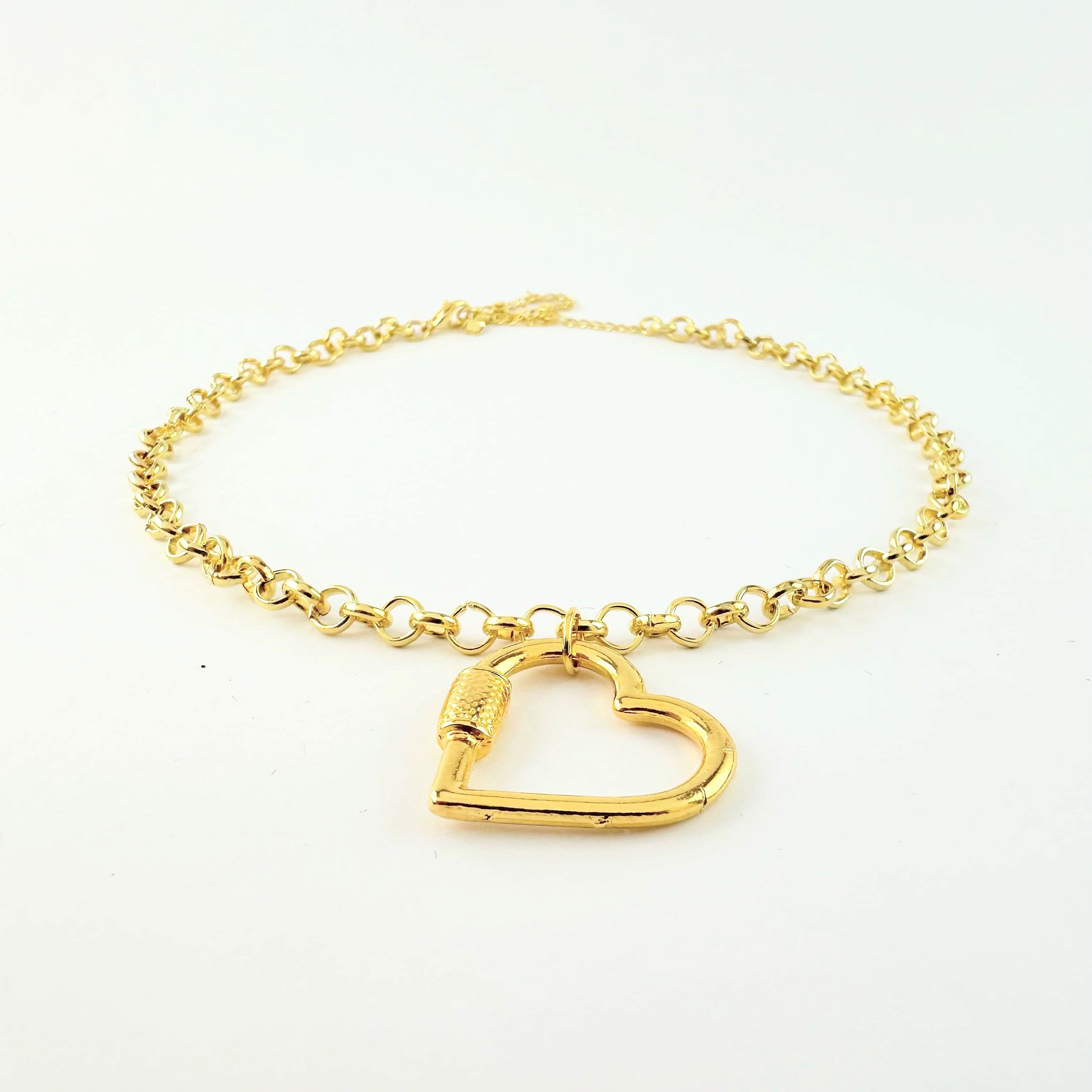 Um colar que pulsa amor e estilo em cada detalhe. A combinação clássica dos elos portugueses com o pingente de coração folheado a ouro cria uma peça marcante e envolvente, perfeita para destacar a feminilidade e a paixão por momentos únicos.